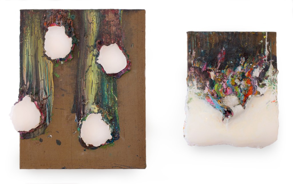 Farbstück VII 29x28x11 2018Klotz II 26x33x12 2016Farbstück III 29x31x09 2018Streifen III 32x27x20 2018 Scholle VIII 28x27x9 2022Scholle VII 26x27x8 2022Scholle IV (gefesselt) 29x31x09 2016Scholle V (gefesselt) 29x31x09 2016Schollen 91x75x6 Acryl auf Sackleinen 2019 Farbflackern 67x55x14 Acryl auf Sackleinen 2019-2022 Detail: Farbflackern Acryl auf Sackleinen